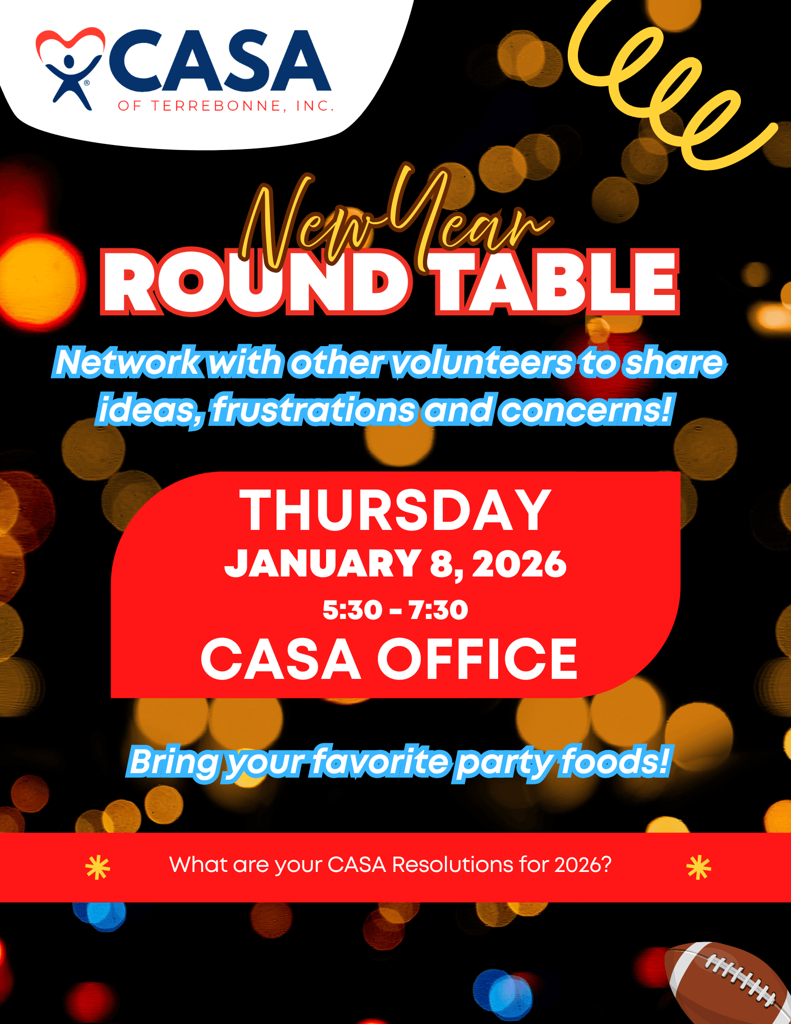 Network with your fellow volunteers to share what your New Year's CASA resolutions are, hear what our resolutions are as a program while we munch on your favorite party dishes! Let's all start the new year off on a positive foot forward!
