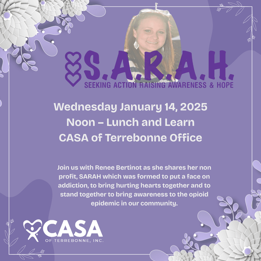 Join us with Renee Bertinot as she shares her non profit, SARAH which was formed to put a face on addiction, to bring hurting hearts together and to stand together to bring awareness to the opioid epidemic in our community.