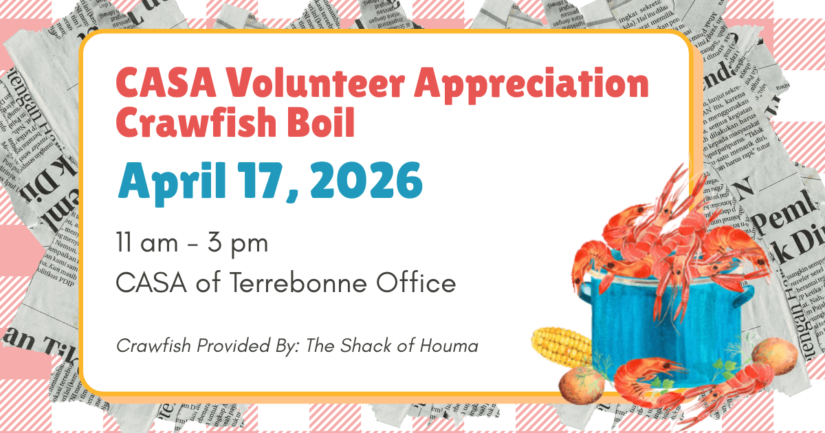 April is Volunteer Appreciation Month, and you know we love to show our appreciation with food! Join us for our Annual Volunteer Appreciation Crawfish Boil on April 17th at the CASA office.
